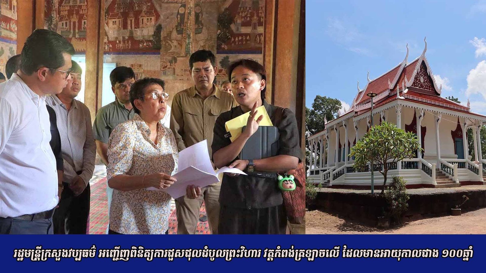 75 កំពង់ឆ្នាំង ៖ លោកជំទាវ បណ្ឌិតសភាចារ្យ ភឿង សកុណា រដ្ឋមន្រ្តីក្រសួងវប្បធម៌ និងវិចិត្រសិល្បៈ នាព្រឹកថ្ងៃទី៤ ខែតុលា ឆ្នាំ២០២៥ បានអញ្ជើញជួបសំណេះសំណាលជាមួយលោកតា លោកយាយ គណៈកម្មការអាចារ្យវត្ត ក្នុងឱកាសអញ្ជើញចុះពិនិត្យការដ្ឋានជួសជុលដំបូលវិហារវត្តកំពង់ត្រឡាចលើ ដំណាក់កាលទីមួយ បន្ទាប់ពីបានបញ្ចប់ដោយជោគជ័យ។ នាឱកាសនោះក៏មានការអញ្ជើញចូលរួមផងដែរពី លោកបណ្ឌិត ហ៊ឺ វីរៈ អ្នកតំណាងរាស្រ្តមណ្ឌលខេត្តកំពង់ឆ្នាំង ថ្នាក់ដឹកនាំក្រសួង និងក្រុមការងារជំនាញក្រសួង និងមន្ទីរវប្បធម៌និងវិចិត្រសិល្បៈខេត្តកំពង់ឆ្នាំង ។ សូមបញ្ជាក់ថា ដំបូលព្រះវិហារវត្តកំពង់ត្រឡាចលើ បានបើកការដ្ឋានជួសជុលកាលពីថ្ងៃទី១០ ខែឧសភា ឆ្នាំ២០២៥ ដោយក្រុមការងារបច្ចេកទេសរបស់ក្រសួងវប្បធម៌ និងវិចិត្រសិល្បៈ។ ការជួសជុលព្រះវិហារវត្តកំពង់ត្រឡាចនាពេលនេះ គឺជាគោលនយោបាយ របស់ក្រសួង ក្នុងការថែរក្សា អភិរក្ស បេតិកភណ្ឌវប្បធម៌ជាតិ ដេីម្បីទុកឱ្យអ្នកជំនាន់ក្រោយបានស្គាល់នូវស្នាដៃដ៏អស្ចារ្យរបស់ដូនតាយើង។ ព្រះវិហារវត្តកំពង់ត្រឡាចលេី គឺជាព្រះវិហារបុរាណ ដែលមានអាយុកាលជាង ១០០ឆ្នាំ ៕ ចែករំលែក: Share on Facebook (Opens in new window) Facebook Email a link to a friend (Opens in new window) Email Share on LinkedIn (Opens in new window) LinkedIn Share on X (Opens in new window) X Share on Telegram (Opens in new window) Telegram រូបអ្នកនិពន្ធ ការផ្សព្វផ្សាយដោយអ្នកនិពន្ធ លោកជំទាវបណ្ឌិត ពេជ ចន្ទមុន្នី ចុះទស្សនកិច្ច ពិនិត្យការអនុវត្តកម្មវិធីផ្តល់អាហារតាមសាលារៀន ដោយប្រើប្រាស់កសិផលក្នុងសហគមន៍ នៅសាលាបឋមសិក្សាប្រាសាទជាងទង ខេត្តកំពង់ឆ្នាំង អនុប្រធានមន្ទីរព័ត៌មាន ខេត្តកំពង់ឆ្នាំង អំពាវ នាវឲ្យសិស្សានុសិស្ស ប្រុងប្រយ័ត្នចំពោះព័ត៌មានក្លែងក្លាយ ក្រុមការងារព័ត៌មាននិងសាធារណមតិ នៃមន្ទីរព័ត៌មានខេត្តកំពង់ឆ្នាំង បន្តធ្វើយុទ្ធនាការប្រឆាំងព័ត៌មានក្លែងក្លាយ នៅវិទ្យាល័យហ៊ុន សែន ទឹកផុស បណ្តាអង្គទូត និងទីភ្នាក់ងារបរទេស អញ្ជើញពិនិត្យមើលសកម្មភាពរំលោភបំពានរបស់ថៃ នៅតំបន់បឹងត្រកួន គំនូរសិល្បៈដើម្បីសន្តិភាព លេចចេញជារូបរាងបណ្តើរៗហើយ នៅមុខវត្តបទុមវតី ដែលមានទំហំធំជាងគំនូរនៅខេត្តសៀមរាប បណ្តាអង្គទូត និងទីភ្នាក់ងារបរទេស អញ្ជើញចុះពិនិត្យមើលការបង្កើតស្ថានភាពថ្មីនៅលើទីតាំងជាក់ស្តែង នៅភូមិជោគជ័យ និងភូមិព្រៃចាន់ Sorn Kunnivoth តាមតាន អត្ថបទពាក់ព័ន្ធ ការកត់ត្រាទុក លោកជំទាវបណ្ឌិត ពេជ ចន្ទមុន្នី ចុះទស្សនកិច្ច ពិនិត្យការអនុវត្តកម្មវិធីផ្តល់អាហារតាមសាលារៀន ដោយប្រើប្រាស់កសិផលក្នុងសហគមន៍ នៅសាលាបឋមសិក្សាប្រាសាទជាងទង ខេត្តកំពង់ឆ្នាំង February 25, 2026 ការកត់ត្រាទុក អនុប្រធានមន្ទីរព័ត៌មាន ខេត្តកំពង់ឆ្នាំង អំពាវ នាវឲ្យសិស្សានុសិស្ស ប្រុងប្រយ័ត្នចំពោះព័ត៌មានក្ល