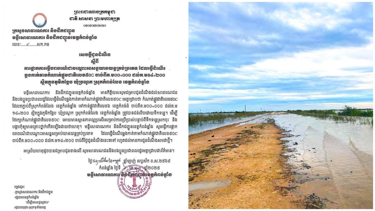93 កំពង់ឆ្នាំង ៖កំណាត់ផ្លូវជាតិលេខ៥០C ដែលតភ្ជាប់ពីស្រុកកំពង់លែង ខេត្តកំពង់ឆ្នាំង ទៅកាន់ផ្លូវជាតិលេខ៦ ក្នុងភូមិសាស្ត្រខេត្តកំពង់ធំ ត្រូវផ្អាកការធ្វើចរាចរណ៍ ជាបណ្តោះអាសន្ន សម្រាប់យានយន្តគ្រប់ប្រភេទ បន្ទាប់ពីទឹកទន្លេបានឡើងជន់លិច ។ ក្នុងសេចក្តីជូនដំណឹងរបស់មន្ទីរសាធារណការ និងដឹកជញ្ជូន ខេត្តកំពង់ឆ្នាំង បានឲ្យដឹងថា កំណាត់ផ្លូវលេខ៥០C ចាប់ពីគីឡូម៉ែត្រ 00+000ដល់គីឡូម៉ែត្រ១៤ +២០០ ក្នុងភូមិសាស្ត្រ ភូមិកង្កែប ឃុំច្រណូក ស្រុកកំពង់លែង ត្រូវបានទឹកទន្លេឡើងជន់លិច ។ ដើម្បីថែរក្សាកំណាត់ផ្លូវជាតិលេខ៥០C ឲ្យមានស្ថានភាពល្អប្រសើរសម្រាប់ការប្រើប្រាស់ បន្ទាប់ពីទឹកទន្លេស្រកចុះ និងបង្ការកុំឲ្យមានគ្រោះថ្នាក់កើតឡើងជាយថាហេតុ មន្ទីរសាធារណការ និងដឹកជញ្ជូន ខេត្តកំពង់ឆ្នាំង បានសម្រេចផ្អាកជាបណ្តោះអាសន្ន សម្រាប់យានយន្តគ្រប់ប្រភេទ ចាប់ពីថ្ងៃទី៦ ខែតុលា ឆ្នាំ២០២៥ តទៅរហូតដល់មានការជូនដំណឹងជាថ្មី ទើបបើកឲ្យធ្វើចរារណ៍ឡើងវិញ ៕ ចែករំលែក: Share on Facebook (Opens in new window) Facebook Email a link to a friend (Opens in new window) Email Share on LinkedIn (Opens in new window) LinkedIn Share on X (Opens in new window) X Share on Telegram (Opens in new window) Telegram រូបអ្នកនិពន្ធ ការផ្សព្វផ្សាយដោយអ្នកនិពន្ធ លោកជំទាវបណ្ឌិត ពេជ ចន្ទមុន្នី ចុះទស្សនកិច្ច ពិនិត្យការអនុវត្តកម្មវិធីផ្តល់អាហារតាមសាលារៀន ដោយប្រើប្រាស់កសិផលក្នុងសហគមន៍ នៅសាលាបឋមសិក្សាប្រាសាទជាងទង ខេត្តកំពង់ឆ្នាំង អនុប្រធានមន្ទីរព័ត៌មាន ខេត្តកំពង់ឆ្នាំង អំពាវ នាវឲ្យសិស្សានុសិស្ស ប្រុងប្រយ័ត្នចំពោះព័ត៌មានក្លែងក្លាយ ក្រុមការងារព័ត៌មាននិងសាធារណមតិ នៃមន្ទីរព័ត៌មានខេត្តកំពង់ឆ្នាំង បន្តធ្វើយុទ្ធនាការប្រឆាំងព័ត៌មានក្លែងក្លាយ នៅវិទ្យាល័យហ៊ុន សែន ទឹកផុស បណ្តាអង្គទូត និងទីភ្នាក់ងារបរទេស អញ្ជើញពិនិត្យមើលសកម្មភាពរំលោភបំពានរបស់ថៃ នៅតំបន់បឹងត្រកួន គំនូរសិល្បៈដើម្បីសន្តិភាព លេចចេញជារូបរាងបណ្តើរៗហើយ នៅមុខវត្តបទុមវតី ដែលមានទំហំធំជាងគំនូរនៅខេត្តសៀមរាប បណ្តាអង្គទូត និងទីភ្នាក់ងារបរទេស អញ្ជើញចុះពិនិត្យមើលការបង្កើតស្ថានភាពថ្មីនៅលើទីតាំងជាក់ស្តែង នៅភូមិជោគជ័យ និងភូមិព្រៃចាន់ Sorn Kunnivoth តាមតាន អត្ថបទពាក់ព័ន្ធ ការកត់ត្រាទុក លោកជំទាវបណ្ឌិត ពេជ ចន្ទមុន្នី ចុះទស្សនកិច្ច ពិនិត្យការអនុវត្តកម្មវិធីផ្តល់អាហារតាមសាលារៀន ដោយប្រើប្រាស់កសិផលក្នុងសហគមន៍ នៅសាលាបឋមសិក្សាប្រាសាទជាងទង ខេត្តកំពង់ឆ្នាំង February 25, 2026 ការកត់ត្រាទុក អនុប្រធានមន្ទីរព័ត៌មាន ខេត្តកំពង់ឆ្នាំង អំពាវ នាវឲ្យសិស្សានុសិស្ស ប្រុងប្រយ័ត្នចំពោះព័ត៌មានក្លែងក្លាយ February 24, 2026 ការកត់ត្រាទុក ក្រុមការងារព័ត៌មាននិងសាធារណមតិ នៃមន្ទីរព័ត៌មានខេត្តកំពង់ឆ្នាំង បន្តធ្វើយុទ្ធនាការប្រឆា