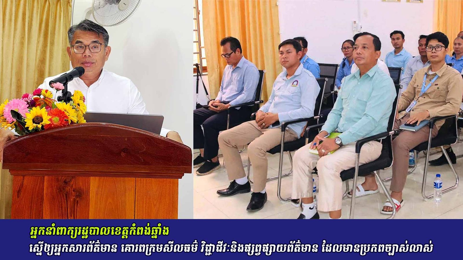 32 កំពង់ឆ្នាំង ៖ លោក សាន់ យូ អភិបាលរងខេត្ត និងជាអ្នកនាំពាក្យរដ្ឋបាលខេត្តកពង់ឆ្នាំង បានស្នើឲ្យអ្នកសារព័ត៌មាន គោរពក្រមសីលធម៌ វិជ្ជាជីវៈ និងត្រូវផ្យព្វផ្សាយព័ត៌មាន ដែលមានប្រភពច្បាស់លាស់ ដើម្បីផ្តល់សុវត្តិភាពដល់អ្នកប្រើប្រាស់ និងធានាសន្តិសុខព័ត៌មាន ។ លោក សាន់ យូ បានថ្លែងដោយស្នើទៅកាន់អ្នកសារព័ត៌មាន នៅក្នុងខេត្តកំពង់ឆ្នាំង បែបនេះ ក្នុងកិច្ចប្រជុំផ្សព្វផ្សាយស្តីពី ការពង្រឹងសណ្តាប់ធ្នាប់សារព័ត៌មាន និងទប់ស្កាត់ព័ត៌មានក្លែងក្លាយ ដែលរៀបចំធ្វើឡើងដោយមន្ទីរព័ត៌មាន កាលពីរសៀលថ្ងៃទី២៧ ខែធ្នូ ឆ្នាំ២០២៥។ លោក អភិបាលរងខេត្តកំពង់ឆ្នាំង បញ្ជាក់ថា ការធានាសិច្ចរិតភាព និងភាពត្រឹមត្រូវនៃព័ត៌មាន គឺជាការចាំចាច់បំផុត សម្រាប់អ្នកសារព័ត៌មាន ដែលត្រូវតែផ្តល់ព័ត៌មាន បានត្រឺមត្រូវ មានប្រភពច្បាស់លាល់ និងគួរឲ្យទុកចិត្តដើម្បីបង្កើនស្មារតីទុកចិត្តរបស់សាធារណជន ។ លោកសាន់ យូ ក៏បានកោតសរសើរដល់ថ្នាក់ដឹកនាំមន្ទីរ មន្រ្តីក្រុមការងារព័ត៌មាន និងសាធារណៈមតិ ដែលក្នុងរយះពេលកន្លងទៅនេះបានសកម្មក្នុងការចូលរួមទប់ស្កាត់ព័ត៌មានក្លែងក្លាយ និងចុះធ្វើយុទ្ធនាការប្រឆាំងព័ត៌មានក្លែងក្លាយ នៅតាមទីប្រជំជន ផ្សារ សាលារៀន និងនៅតាមអង្គភាពនានាក្នុងខេត្ត ៕ ចែករំលែក: Share on Facebook (Opens in new window) Facebook Email a link to a friend (Opens in new window) Email Share on LinkedIn (Opens in new window) LinkedIn Share on X (Opens in new window) X Share on Telegram (Opens in new window) Telegram រូបអ្នកនិពន្ធ ការផ្សព្វផ្សាយដោយអ្នកនិពន្ធ លោកជំទាវបណ្ឌិត ពេជ ចន្ទមុន្នី ចុះទស្សនកិច្ច ពិនិត្យការអនុវត្តកម្មវិធីផ្តល់អាហារតាមសាលារៀន ដោយប្រើប្រាស់កសិផលក្នុងសហគមន៍ នៅសាលាបឋមសិក្សាប្រាសាទជាងទង ខេត្តកំពង់ឆ្នាំង អនុប្រធានមន្ទីរព័ត៌មាន ខេត្តកំពង់ឆ្នាំង អំពាវ នាវឲ្យសិស្សានុសិស្ស ប្រុងប្រយ័ត្នចំពោះព័ត៌មានក្លែងក្លាយ ក្រុមការងារព័ត៌មាននិងសាធារណមតិ នៃមន្ទីរព័ត៌មានខេត្តកំពង់ឆ្នាំង បន្តធ្វើយុទ្ធនាការប្រឆាំងព័ត៌មានក្លែងក្លាយ នៅវិទ្យាល័យហ៊ុន សែន ទឹកផុស បណ្តាអង្គទូត និងទីភ្នាក់ងារបរទេស អញ្ជើញពិនិត្យមើលសកម្មភាពរំលោភបំពានរបស់ថៃ នៅតំបន់បឹងត្រកួន គំនូរសិល្បៈដើម្បីសន្តិភាព លេចចេញជារូបរាងបណ្តើរៗហើយ នៅមុខវត្តបទុមវតី ដែលមានទំហំធំជាងគំនូរនៅខេត្តសៀមរាប បណ្តាអង្គទូត និងទីភ្នាក់ងារបរទេស អញ្ជើញចុះពិនិត្យមើលការបង្កើតស្ថានភាពថ្មីនៅលើទីតាំងជាក់ស្តែង នៅភូមិជោគជ័យ និងភូមិព្រៃចាន់ Sorn Kunnivoth តាមតាន អត្ថបទពាក់ព័ន្ធ ការកត់ត្រាទុក លោកជំទាវបណ្ឌិត ពេជ ចន្ទមុន្នី ចុះទស្សនកិច្ច ពិនិត្យការអនុវត្តកម្មវិធីផ្តល់អាហារតាមសាលារៀន ដោយប្រើប្រាស់កសិផលក្នុងសហគមន៍ នៅសាលាបឋមសិក្សាប្រាសាទជាងទង ខេត្តកំពង់ឆ្នាំង February 25, 2026 ការកត់ត្រាទុ